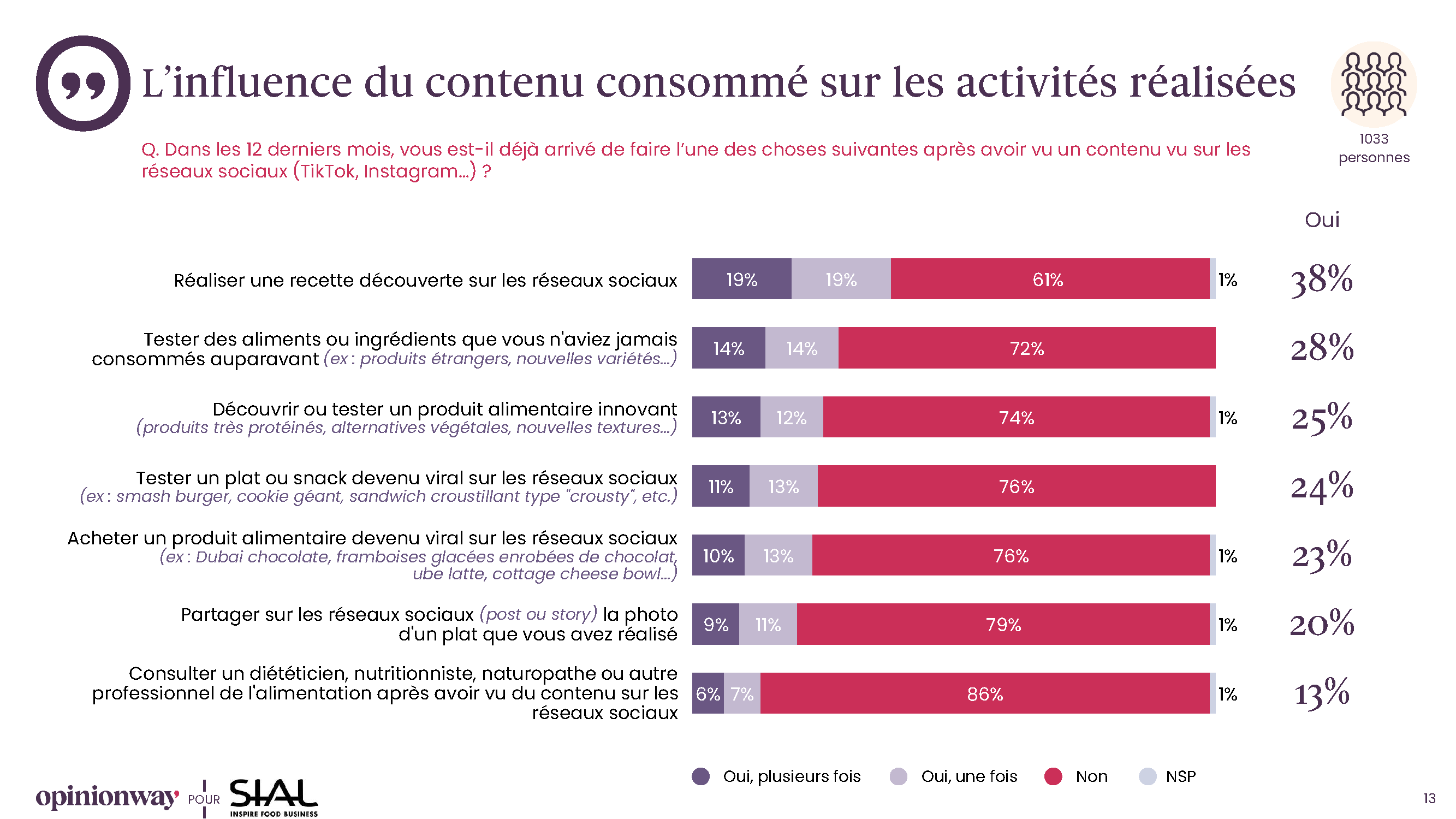 Au cours des douze derniers mois, 38 % des Français ont cuisiné une recette vue sur les réseaux, 28 % ont goûté des aliments inédits et 25 % ont découvert des produits innovants comme les alternatives végétales ou les super-aliments. Les produits viraux, tels que le « Dubaï chocolate » ou les framboises glacées enrobées de chocolat connaissent un succès fulgurant, porté par des vidéos TikTok cumulant des millions de vues.