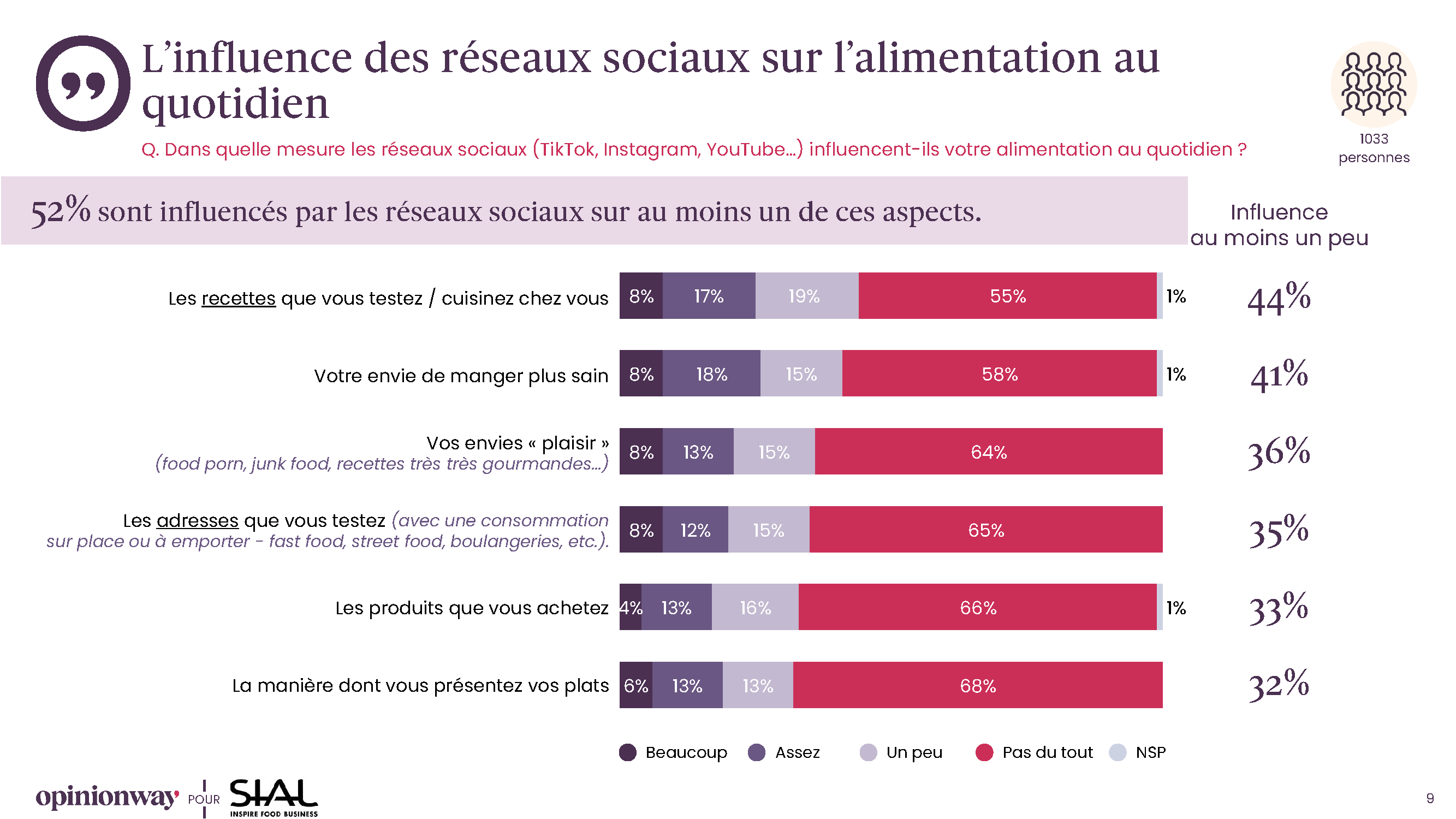 Les réseaux sociaux ne se contentent pas d’inspirer, ils poussent à l’action. L’étude montre que 44 % des Français testent de nouvelles recettes après les avoir découvertes en ligne, tandis que 41 % adoptent une alimentation plus saine sous l’effet des réseaux sociaux. Les envies de produits gourmands, souvent qualifiés de « food porn », concernent quant à elles 36 % des répondants.